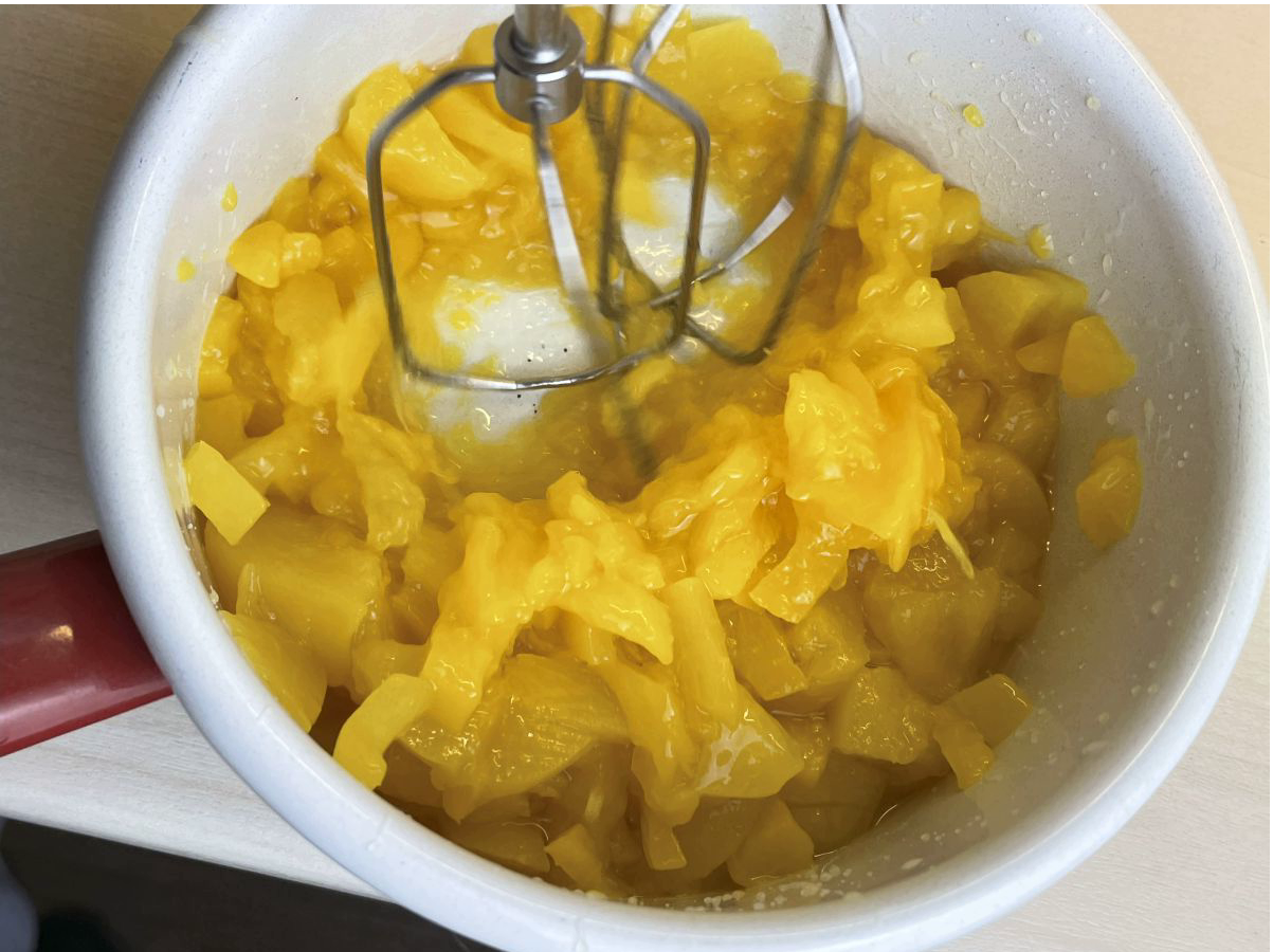 5. Dáme vychladit do lednice a mezitím si rozmixujeme 1 plechovku broskví na pyré, které zahustíme a jakmile trochu vychladne, tak jím přelijeme horní vrstvu dortu. Dortem lehce zatřeseme, aby se vrstva pyré srovnala do roviny.