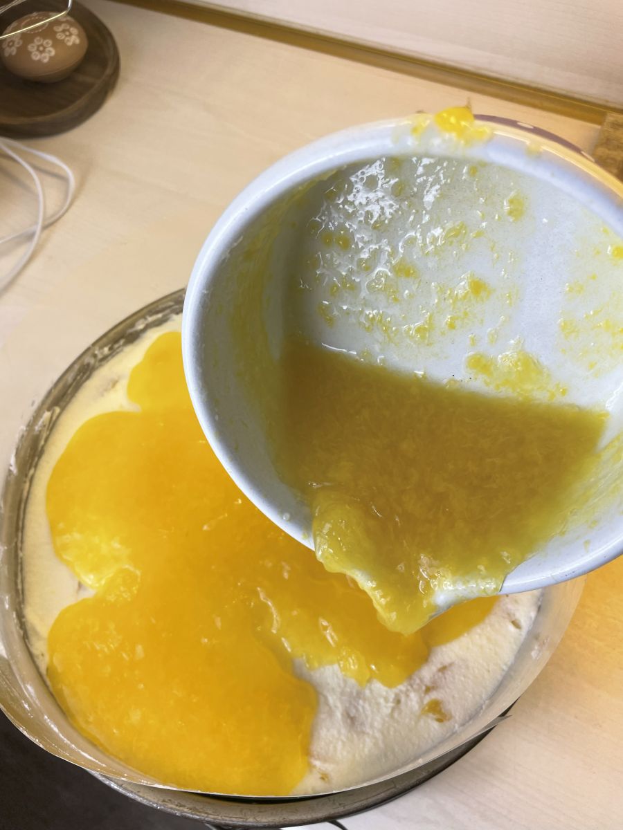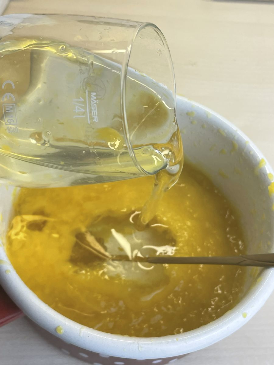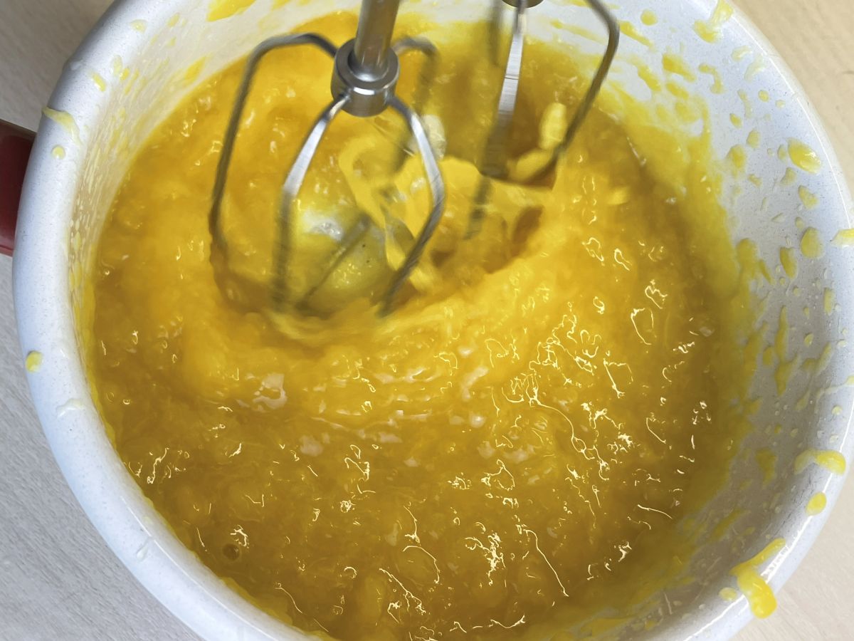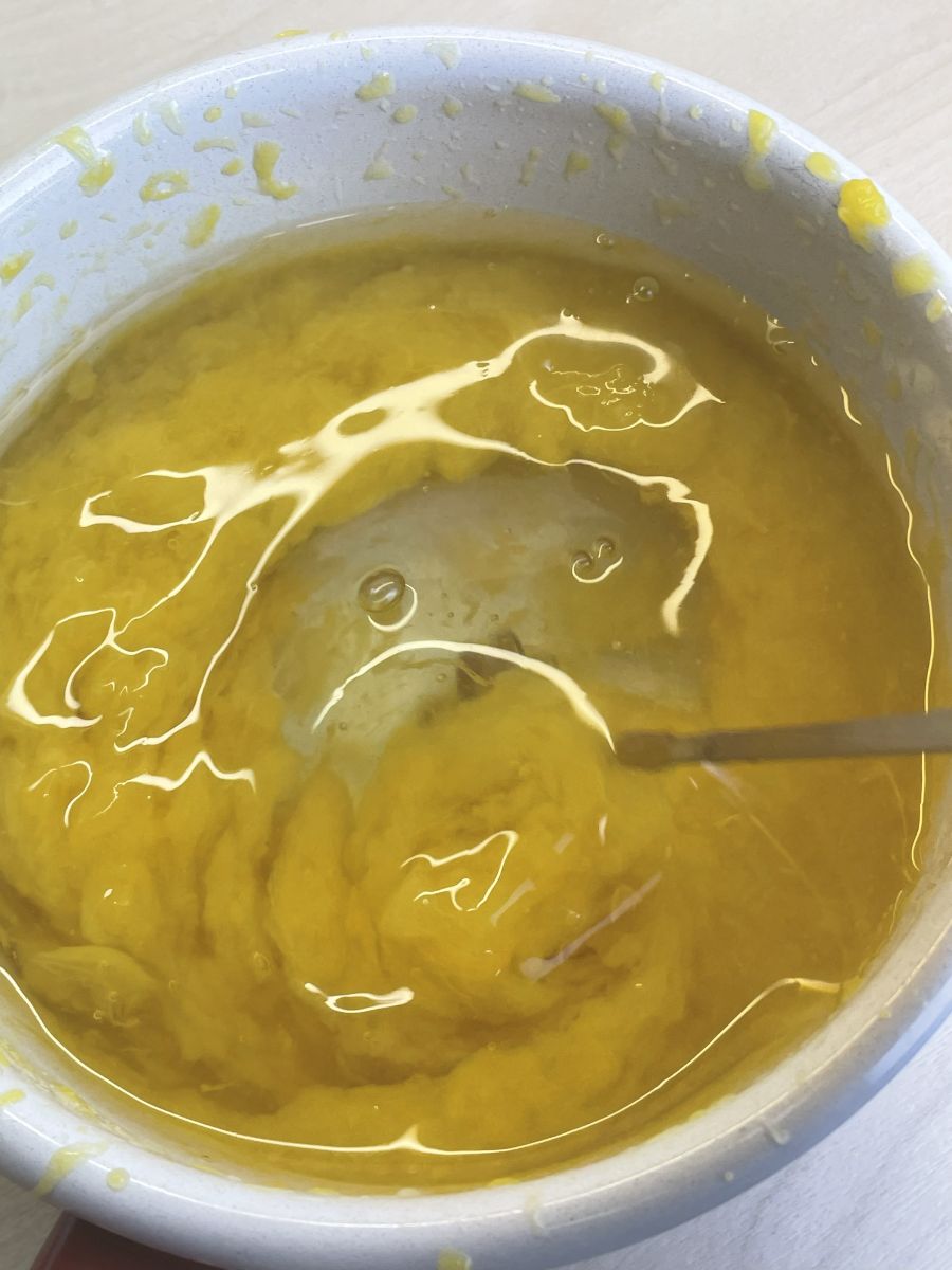 2. Přidáme 50 ml šťávy a promícháme (pokud je pyré hustší, klidně až 70 ml, aby bylo roztíratelné v tenké vrstvě).