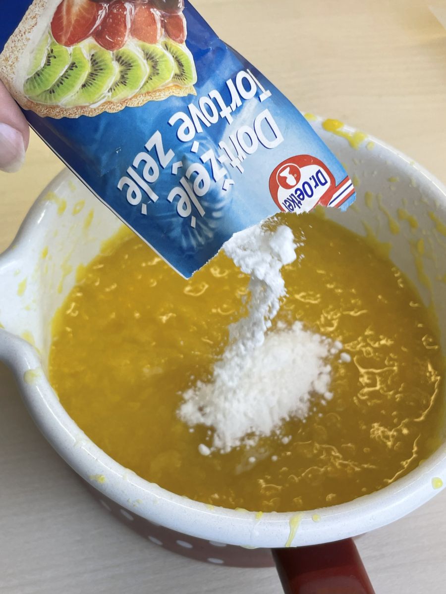 3. Vmícháme 1 sáček Sofort-Gelatine nebo Dort-želé – sypeme přímo do pyré a ihned dobře metličkou promícháme, aby se nevytvořily hrudky.