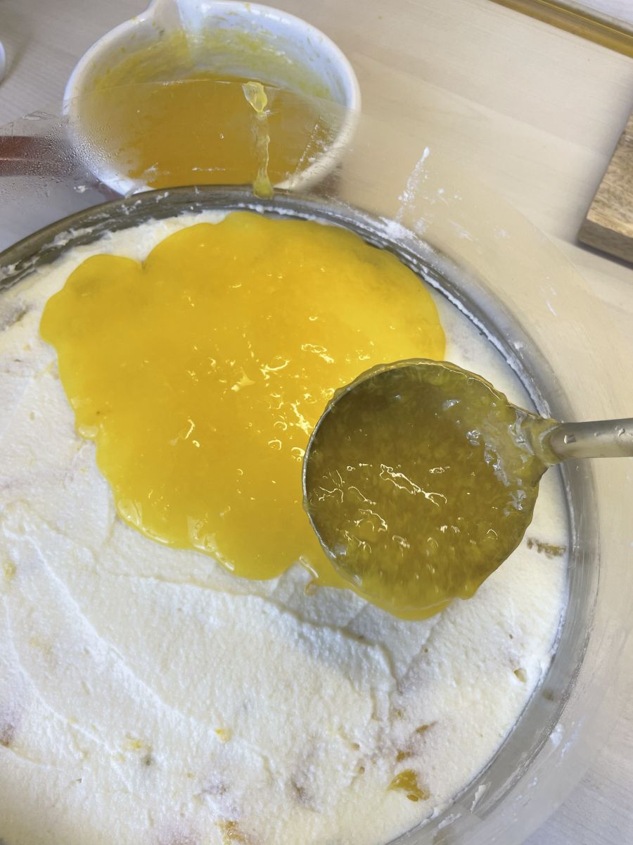 5. Nalijeme na vychlazený smetanovo-tvarohový krém a rozetřeme do tenké vrstvy.
